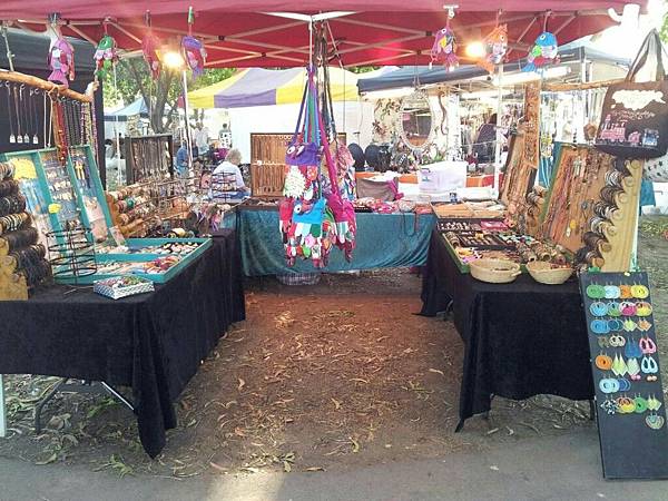 還好還能找到之前的攤位照片,留個紀念也好~當年在Mindil beach market擺攤,如果是五點開始的夜市,我得一點就到,然後開始長達三四小時的重訓,搬五張折疊大桌子下車,然後是五個大的木頭展示箱,跟著還有四五箱塑膠收納箱,裡面裝滿了貨,跟著是兩大袋放包包的貨,一一搬出來然後再爬上桌子綁好展示箱,沒個三四小時是弄不好的。