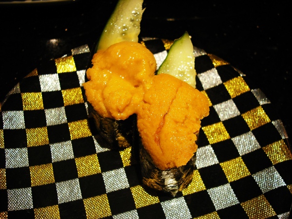 不過說到海膽,我在爭鮮是不點海膽的,因為某次嘗試過後覺得很臭,貧賤村婦如我,一直狐疑,海膽這種臭得像屎一樣的玩意(其實長的也像...)為何港仔趨之若鶩???後來去了玄海,鼓起勇氣再度挑戰海膽,結果才發現,原來品質好的海膽是這麼的鮮~甜~啊~以下就是爭鮮的海膽壽司。泥坎坎!泥坎坎!多麼的晶亮鮮美啊~