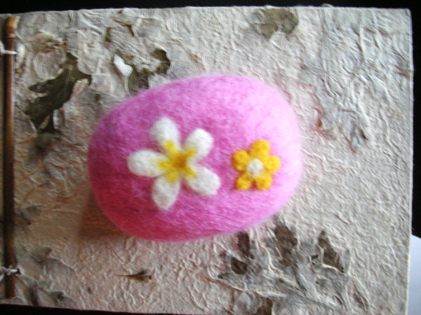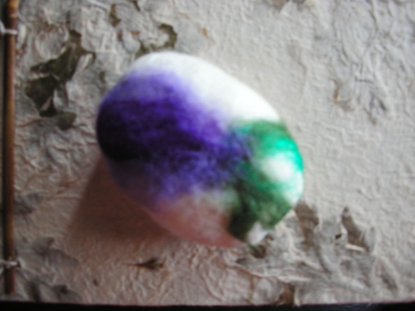 這是唯一一個不用戳針戳圖案的羊毛皂。先將白色底的羊毛固定後,再隨意鋪上紫花綠葉的輪廓加以搓洗,有點水彩畫的感覺~