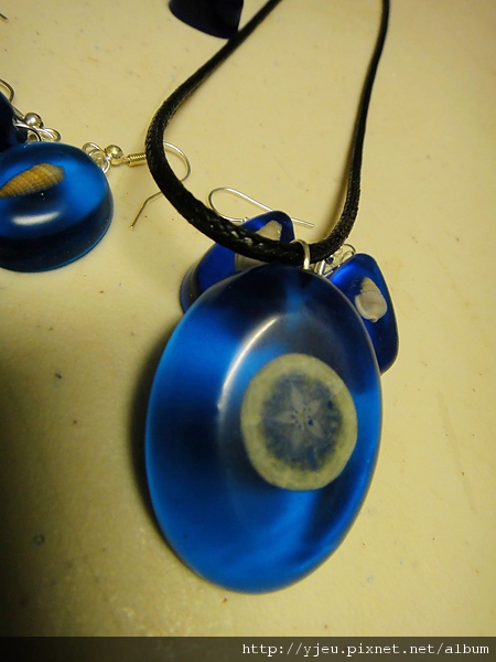 下面這條項鍊,就是用稀有的sand dollar鑲嵌的~照片中看不太清楚,不過還是能隱約見到貝殼中央的星型。它們的英文名稱,總是讓我覺得這是在美人魚族中通行的貨幣:P