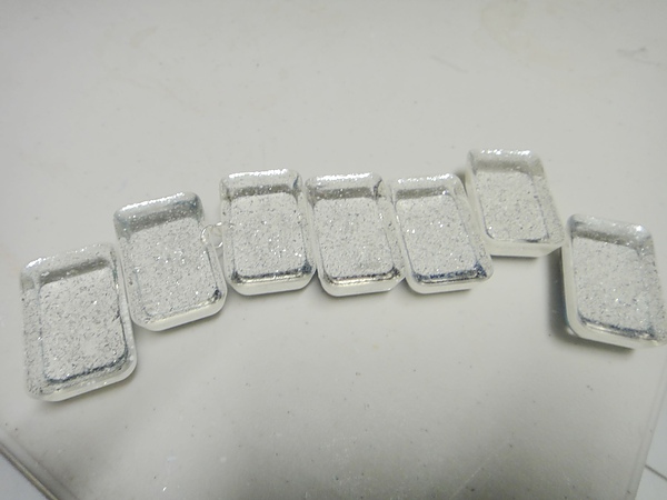 接著還是一樣調製跟攪拌水晶膠,倒入製冰格後趁著未乾之際,把修剪好的照片反面置入製冰格中,然後再調底層的膠,倒入。最後再灑上銀粉當底就好囉~