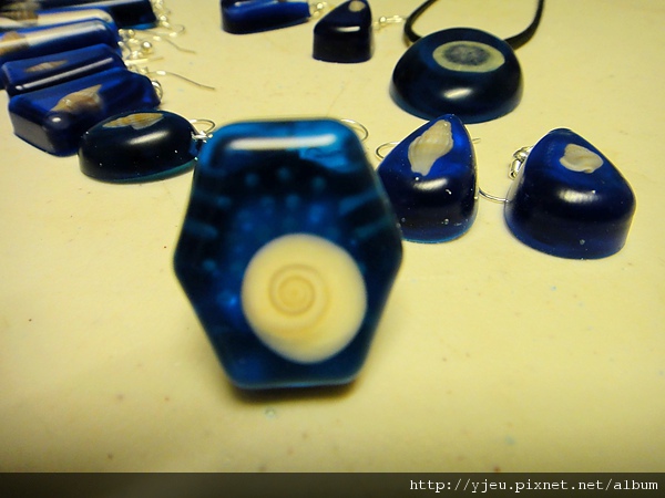 然後是靜置二十四小時後,就可以把它們一顆顆的挖出來囉~其實不應該用挖的,只是我沒買幫助脫模的東西,又不敢用小鎚子在背面敲這個很貴的模子,只好...像挖鼻屎一樣的挖它們了...挖出來後還要一顆一顆的細細研磨,因為背面邊緣有些尖銳的突起,所以要用材料包附的砂紙研磨。這還沒完!要做耳環跟手鍊項鍊的話,還要用電鑽,一顆顆的鑽洞,才能把耳鉤或是C圈穿過去~做戒指的話就簡單多了,用熱熔槍把戒台黏上去就好。