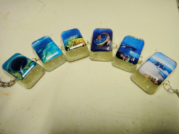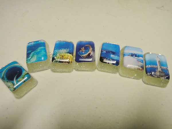 下面這是另一個嘗試。用製冰盒當模子做的"世界奇景手鍊"(右二那可是台灣的玉山喲!)。這次上網找了些美景的照片,把大小調整成跟製冰格一樣後,用相紙列印出來(不能用普通的白紙),修剪成圓角以便完全服貼製冰格底部型狀。